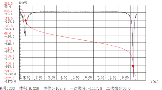 突躍量的選擇:經(jīng)過(guò)試驗(yàn),發(fā)現(xiàn)鹽酸金剛烷胺滴定時(shí)溶液第二終點(diǎn)電位突躍不很明顯,故選擇突躍量時(shí)應(yīng)特別注意。(建議**終點(diǎn)突躍量:500 第二終點(diǎn)突躍量:150。)