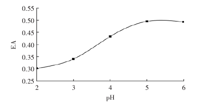 [5]等人在研究大豆乳化性質的課題中,采用不同梯度的pH值對大豆蛋白粉進行處理,加熱溫度為60℃下,采用1mol/L的鹽酸調節(jié)大豆蛋白溶液的pH,范圍為2.0-6.0,處理30min,測定其乳化性。結果如圖: