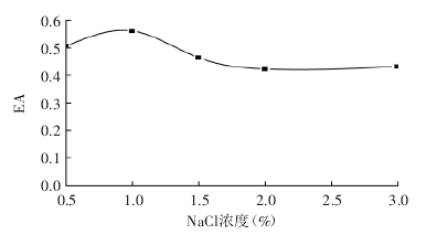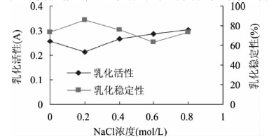 [9]等人在研究鷹嘴豆分離蛋白乳化性質時,選用不同梯度的離子濃度,分別為0.1、0.2、0.4、0.6、0.8mol/L的NaCl溶液,測定乳化活性和乳化穩(wěn)定性。結果如下: