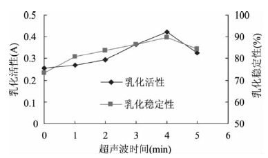 從圖中明確看出,處理時間為4min時,乳化活性和乳化穩(wěn)定性達到**大值。這是因為在超聲波作用下,蛋白質分子的結構變得疏松,使疏水性多肽部分展開朝向脂質,極性部分朝向水相,故乳化活力增加。但繼續(xù)延長超聲波處理時間,蛋白質變性程度增大,不溶性蛋白質含量增多,乳化活力及乳化穩(wěn)定性隨之又降低。