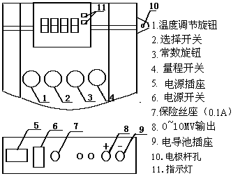 b. 用溫度計測出被測液的溫度后,將“溫度”鈕置于被測液的實際溫度相應位置上。當“溫度”鈕置于25℃位置時,則無補償作用。